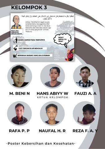 KELOMPOK 3 M. BENI N HANS ABIYY W FAUZI A. A K E T U A K E L O M P O K RAFA P. P NAUFAL H. R REZA F. A. Y -Poster Kebersihan dan Kesehatan-