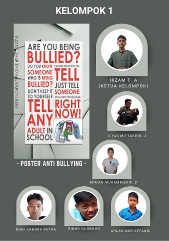 KELOMPOK 1 IRZAM T. A (KETUA KELOMPOK) ILYAS MIFTAKHUL J - POSTER ANTI BULLYING - AFRIAN MUHAMMAD R. S RONI CANDRA PUTRA RIDHO NUGROHO AHLAN NUR AFFANDI