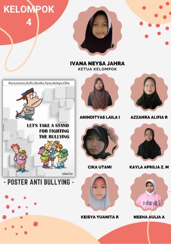 KELOMPOK KELOMPOK 2 4 IVANA NEYSA JAHRA KETUA KELOMPOK ANINDITYAS LAILA I AZZAHRA ALIFIA R CIKA UTAMI KAYLA APRILIA Z. M - POSTER ANTI BULLYING - KEISYA YUANITA R NESHA AULIA A